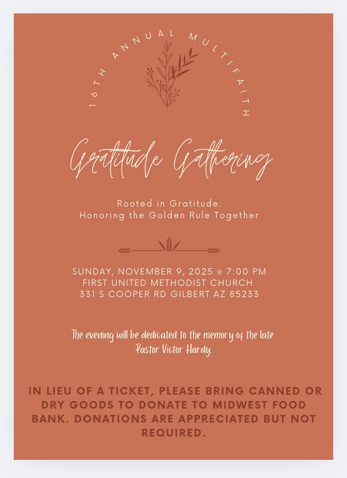 Join us for this cherished holiday tradition, a welcoming space celebrating unity, respect, and gratitude across diverse faiths and cultures. Hosted by For Our Town Gilbert and For Our City Chandler, the event features service, dialogue, music, and the Golden Rule in action. Rev. Monica will offer a special blessing during the gathering.